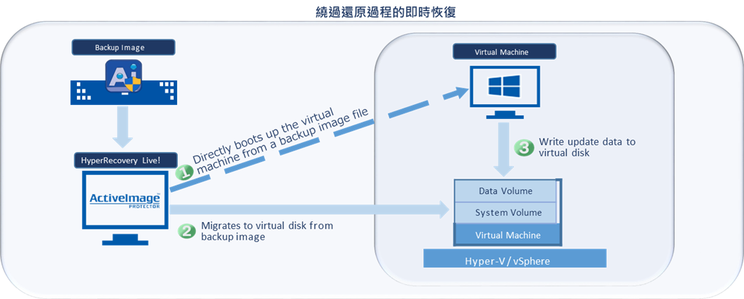從備份檔案啟動虛擬機以繼續服務操作,在後台將運行中的虛擬機遷移到虛擬硬碟,繞過還原過程並允許不間斷的虛擬機操作。